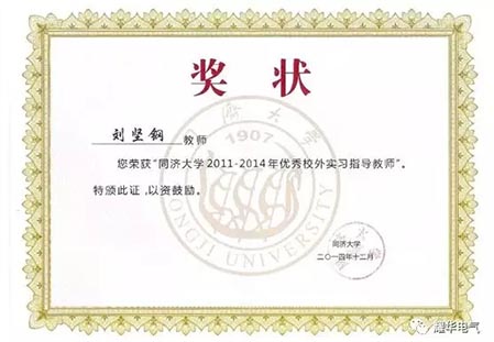▲公司創始人劉堅鋼獲評同濟大學2011—2014年優秀校外實習指導教師