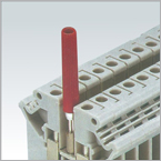 | 安裝軌(詳見P24)終端固定件 適用于TH35/7.5 型和G 32型標準安裝軌,起端子排兩端的定位作用。 | 試驗插頭 由Φ2.3和 2.4兩個規(guī)格和與之相對應(yīng)的(裝在端子導(dǎo)電件中心螺孔上)測試插座形成的測試連接,可檢測接線端子排在運行時的各類電氣參數(shù)。試驗插頭手柄有八種顏色可供選用。 | 標記條 主要用于標識各端子在接線端子排中的順序位置或?qū)?yīng)電路中導(dǎo)線連接點的標志。每條10位,能橫(豎)向打印數(shù)碼和字母或其它標識內(nèi)容,可在端子組裝成排后快速安裝在上部兩端的標記槽內(nèi)。 | 絕緣隔片 用于相鄰聯(lián)絡(luò)端子組的分組和電氣隔離。所有聯(lián)絡(luò)端子組的兩端必須加裝絕緣隔片,可在接線端子組裝后再插入,不會影響整體空間。 |